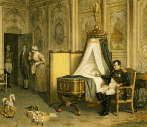В ночь с 24 на 25 января 1814 г. Наполеон должен был выехать к армии. Регентшей империи он назначил свою жену, императрицу Марию-Луизу. В случае смерти Наполеона на императорский престол должен был немедленно вступить его трехлетний сын, римский король, при продолжающемся регентстве матери. Наполеон так любил это маленькое существо, как он в своей жизни никогда никого не любил. Знавшие Наполеона даже и не подозревали в нем вообще способности до такой степени к кому бы то ни было привязываться. Барон Меневаль, один из личных секретарей Наполеона, говорит, что был ли занят император у своего стола, писал ли, читал ли у камина,- ребенок не сходил с его колен, не хотел покидать его кабинета, требовал, чтобы отец играл с ним в солдатики. Он один во всем дворце нисколько не боялся императора и чувствовал себя в кабинете отца полным хозяином. 24 января Наполеон весь день провел у себя в кабинете за срочными делами, которые нужно было устроить перед отъездом на эту решающую войну, перед грозной боевой встречей со всей Европой, поднявшейся против него. Ребенок со своей деревянной лошадкой был, как всегда, около отца, и так как ему, по-видимому, надоело наблюдать возню Наполеона с бумагами, то он стал дергать отца за фалды сюртука, требуя внимания к себе. Император взял его на руки и стал подкидывать кверху и ловить. Маленький римский король был в полнейшем восторге и без счета целовал отца. Но наступил вечер, и его унесли спать. В три часа утра дежурившая в эту ночь в детской спальне няня увидела неожиданно вошедшего потихоньку (лa pas de loup╗) Наполеона, не знавшего, что за ним наблюдают. Войдя, он неподвижно постоял около кровати спавшего глубоким сном ребенка, долго глядел на него, не спуская глаз, и вышел. Через минуту он уже был в экипаже и мчался к армии. Больше он уже никогда не видел своего сына.