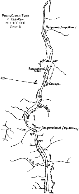 На р. Каа-Хем порогов всего несколько штук, разделенных протяженными плесами. Все они имеют собственные имена.