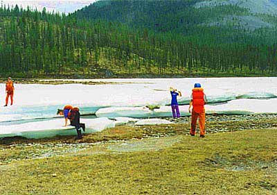 От этого дацана мы шли еще 1.5 часа по долине. Общее время хода - 10.5 часов. Стас в прошлый раз шел на Шумак 9 часов. Мы расположились лагерем на правом берегу Шумака на поляне вблизи моста через реку. Там были еще домики, в которых жили другие группы. В этом месте - слияние двух Шумаков. Основные источники расположены по левому берегу, радоновые - по правому. Перед слиянием - мост через реку. Вблизи нас были радоновые бани, радоновый глазной источник и другие. Место было нормальное, только мало дров в лесу.