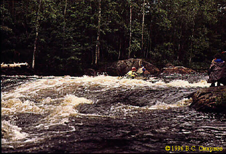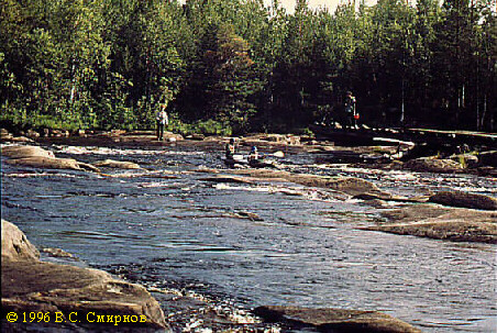 Порог No26 (Iб, 150 м). Глубокая шивера, хорошо просматриваемая с воды. Сходу. Через 150 м --