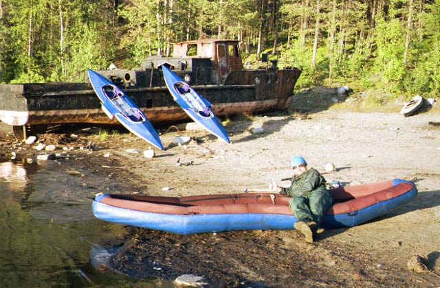 В конце порога на левом берегу стояла третья попутная группа, проходящая под кодовым именем "пионеры": 13 человек (в основном школьники из Мытищ) на неустановленном количестве катамаранов и примкнувший к ним странный дедушка с двумя внуками на рыбацкой (!) надувной лодке. Он признался, что до похода вообще плохо представлял себе, куда идет, а в походе еще хуже представлял себе, как идти дальше.
