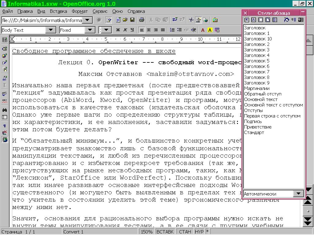 Значительным шагом к систематизации опыта, вырабатываемого школьным курсом, на наш взгляд, является использование инструментария, позволяющего демонстрировать возможность работы с размеченным текстом разными средствами. Это значит, что к очевидным требованиям, предъявляемым к "учебному" word-процессору (достаточность функций, локализованность, мультиплатформенность, ценовая доступность), добавляется серьезное пожелание: стандартность формата разметки.