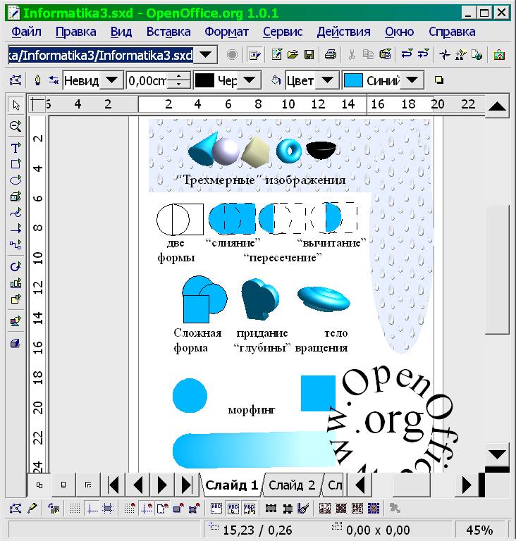 Документ OpenDraw называется "рисунком", что несколько дезориентирует, поскольку на самом деле он может содержать целую "пачку" отдельных изображений, называемых слайдами. Каждый слайд, в свою очередь, может содержать один или более слоев .