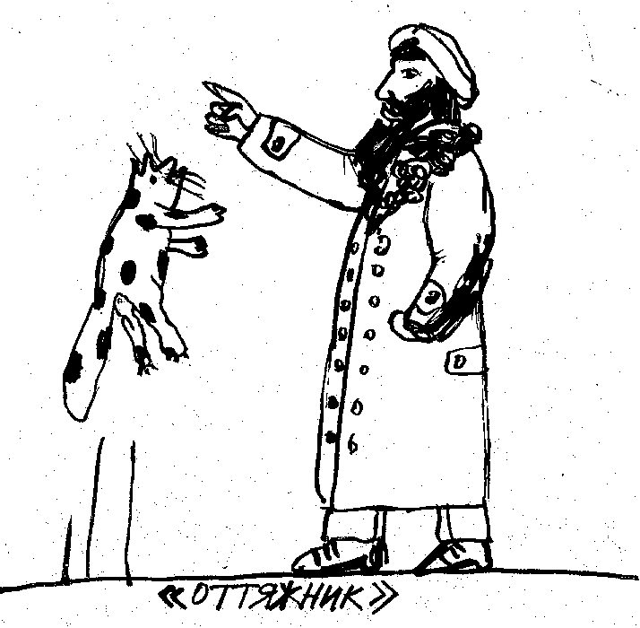 ОТТЯЖНИК - кто-либо, привлекший внимание митька, например, высоко прыгнувший кот. (Кстати, митьки чрезвычайно внимательны к животному миру, выражают свое внимание очень бурно.)
