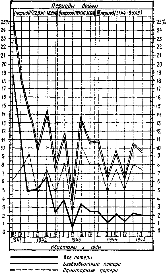 График, отображающий отношение потерь к численности (таблица 139) показывает, какие на протяжении войны имели место резкие колебания в числе различных видов потерь. В первые месяцы 1941 г. безвозвратные потери достигают наибольшего показателя, превышая санитарные. Затем, при некоторой стабилизации фронта, улучшении учета безвозвратные потери уменьшаются, а санитарные растут. Процентное отношение общих потерь к списочному составу армии, как видно из графика, имеет резкие колебания, связанные с интенсивностью боевых действий на фронте. Заметен также и резкий спад числа потерь во втором квартале 1943 г. в период так называемой оперативной паузы (1 апреля -- 30 июня 1943 г.)