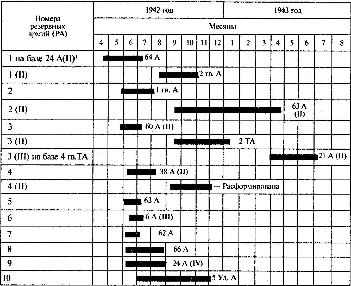 К середине 1942 г. число армейских объединений в действующих фронтах увеличилось до 58 или почти вчетверо (см. таблицу 151), однако количество соединений и частей родов войск для их усиления возросло незначительно. Так, артиллерии в армии стало поступать больше лишь примерно на один полк, зенитных средств менее, чем на один полк. В три раза увеличилось количество авиаполков, в то же время во столько же раз уменьшилось количество авиадивизий на одну общевойсковую армию.