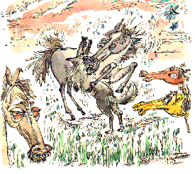 Конь (поднимаясь). Я силен, как прежде!.. (Начинает валиться в сторону.)