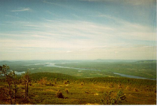 Здесь еще одна дневка. Сергей, наконец, наловил рыбы на одном из мелких озер. Купались на пляже в 500 м от стоянки. Я с матросом залез на гору Копполойва, 454 м. Идти около 2-3 часов сначала по дороге вдоль озера, потом по идущей "наверх" заброшенной лесовозке со свежими медвежьими следами. Наверху на склоне - старая лесосека. Еще чуть выше - безлесная макушка с мачтой. В ясный день с горы просматриваются все окрестные большие озера - практически на 360 градусов и можно проследить почти весь наш путь. Вид великолепный!