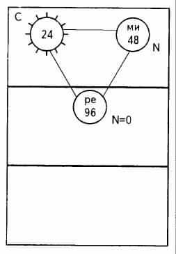 Второе впечатление, производимое фактом моего "самовоспоминания", и есть лишний толчок. Более того, часто случается, что дополнительное ощущение, связанное с "самовоспоминанием", приносит с собой элемент эмоции, т. е. работа машины привлекает к рассматриваемому месту некоторое количество углерода 12. Усилия вспомнить себя, наблюдение за собой в момент восприятия впечатлений, наблюдение впечатлений человеком в момент получения их, так сказать, регистрация приема впечатлений, и одновременное определение характера впечатлений -- все это, вместе взятое, удваивает силу впечатлений и переводит до 48 в ре 24. В то же время усилие, связанное с переходом одной ноты в другую, и само превращение 48 в 24 позволяет до 48 третьей октавы войти в контакт с ми 48 второй октавы и сообщить этой ноте требуемый для перехода ми в фа заряд энергии. Таким образом, толчок от до 48 доходит до ми 48 и предоставляет второй октаве возможность развития.