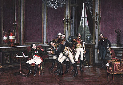 Александр сначала колебался; и он и австрийский император Франц не очень протестовали бы против воцарения трехлетнего ЋНаполеона IIЛ, но роялисты, окружавшие союзных монархов, настояли на том, чтобы предложение Наполеона было отвергнуто. Колебания союзников прекратились, когда им стало известно об измене Мармона. Теперь, после ухода главных сил, бывших непосредственно в распоряжении Наполеона, его нападение на Париж становилось невозможным, и союзники решили предоставить престол Бурбонам. ЋУбедите вашего повелителя в необходимости подчиниться року,- сказал Александр, прощаясь с Коленкуром.- Все, что только будет возможно сделать для почета (Наполеону), будет сделаноЛ,-и он снова назвал Наполеона Ћвеликим человекомЛ.