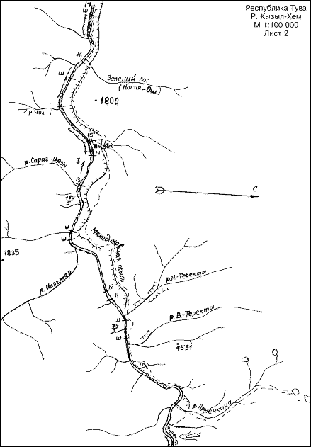 Сплав по р. Кызыл-Хем в избранном варианте маршрута начинается от пос.Уш-Бельдыр (Северный Аржаан), который связан с Кызылом авиационным сообщением. Аэропорт расположен на левом берегу р. Белин 1-2 км выше ее устья. Однако поскольку основная часть груза (включая лодки) была доставлена вертолетом и выгружена значительно ближе к поселку, сплав был начат в одной из проток в дельте р. Шишхид-Гол.