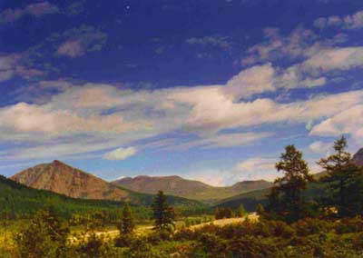 От этого дацана мы шли еще 1.5 часа по долине. Общее время хода - 10.5 часов. Стас в прошлый раз шел на Шумак 9 часов. Мы расположились лагерем на правом берегу Шумака на поляне вблизи моста через реку. Там были еще домики, в которых жили другие группы. В этом месте - слияние двух Шумаков. Основные источники расположены по левому берегу, радоновые - по правому. Перед слиянием - мост через реку. Вблизи нас были радоновые бани, радоновый глазной источник и другие. Место было нормальное, только мало дров в лесу.