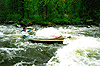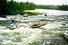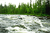 Весело. Далее порог "Перекат", то же пройден. Далее 3 "Верхних Еловых" порога. Проходимы после просмотра. На первом "Нижнем еловом" пороге Пашка неудачно выходит из порога и бортом наваливается на камень, и река делает свое дело - потихоньку наматывает байду на камень. Пашка и Ольга выпрыгивают из байдарки, пытаясь снять ее с камня. Я быстро высаживаю своих и вывожу Ольгу из порога. Павлик сумел вытянуть байду и, как подводную лодку провел ее к берегу. Пока отжимались и выливали воду, девчонки сделали перекусить. Пятый "Нижний Еловый" порог мы долго просматривали, не решаясь идти. Первым рванул Вовка, но в начале порога сел на камень и залил байду. Потом пошел я. Начало немного неудачно, пару раз приложился. Но потом в месте, где надо было уходить с правого берега под левый, чувствую, что не успеваю и, вдруг, как будто чья то сила, взяла и развернула байдарку туда, куда нужно. Ощущал себя маленьким корабликом, который кто-то сильный и большой, видя, что что-то не так, провел по сложному участку порога, как детскую игрушку. Оставил метровый слив слева, прошел по правому краю основной струи, и опять ушел влево от бочки в основной струе, и в конце выкатился в середину. Ф-у-у-у. Наверное, глаза круглые и большие. Адреналин из ушей лезет. Здорово.