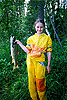 Но вот как-то выпал день, когда Павлик заленился и я, воспользовавшись моментом, выпросил у него вожделенную снасть. Прицепил свою любимую блесну, которая не захотела расстаться со мной в пороге, вцепившись в анорак всеми тремя крючками и, посадив своих девчонок, переплыл на другой берег. Сделали короткий обнос "Домашнего" и девчонки вооружившись шестом и пенками, поплыли искать затонувшие вещички. Я шел по бережку, облавливая стремнинки, места за обливными камнями, в надежде на удачу. Хватка форели на редкость резка и мощна даже у маленьких особей. Поэтому и азарт, и удовольствие - неописуемые. Вытащив пару форелей и некрупного хариуса в низовье "Хариусного", неспешно продвинулся к основному сливу. Солнце, играя на брызгах волн, резко очерчивает границу света и тени на воде. Рядом с основной струей глубокое место с вихревыми потоками. Бросаю выше этого места - прямо в основную струю и быстро подматывая, провожу блесну по диагонали. Вдруг, снизу из глубины основного потока, вырвалась молния с громадной пастью и, сделав немыслимый вираж, атаковала приманку. Меня обдало жаром. Хариус! Здоровый! Но, мимо. Странно, как будто ничего и не было. По-прежнему прозрачная шумящая вода, и... никого? Еще одна проводка. Ничего. Еще раз, и вдруг как повтор гола в футболе, та же стремительная атака, но на этот раз есть. Подсечка. И тут вспоминаю - у меня лесочка то 0.2, поводочка нет, а рожа, сидящая на конце лески и не собирается выходить из воды. Делаю послабее автоспуск и с замиранием сердца, выматываю соперника. Все, чувствую, поддается на мои движения, начинаю подводить к берегу. Вот уже близко, вот сюда - подальше от глубины, и ... черт, леска рвется. Бросаюсь вперед к рыбине, хватаю руками и выбрасываю подальше на берег. Кумжа. Красивое золотистое тело, блестящее на солнце, с короткой хищной, полной мелких иострых зубов мордой, радужные пятна по сильному телу -- красавица, да и только. Оглушаю рыбину и поднимаю ее на вытянутую руку с мощным, диким воплем, родившимся в темных закутках подсознания. На крик сбегается мое семейство, -- радуются, танцуют и фотографируются с трофеем.