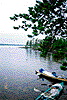 Далее решаем обнести оставшиеся пороги и встать на дневку, надо все осознать, и выработать дальнейший план действий. Встаем на стоянке, на левом берегу Винчи -- сразу за порогом "Домашним". Стоянка не плохая, но больно много комаров. Ребята обустраиваются, а мы с Павликом берем байдарку и идем искать утопленные вещички. Сидеть очень неудобно, как не сядешь, все болит. Соорудили большую жердь, вбили пару гвоздей на ее конец и поплыли, высматривая на дне что-либо. Ага, вот светится шкура, довольно глубоко -- метра три. Достаем. Зрелище печальное, хотя рваная только дека, днище в первозданном виде и только нос и корма немного побиты. В носу оказался обломленный форштевень в том месте, где должен крепиться первый шпангоут. Потом находим задний форштевень, точно в таком же состоянии, правда со сломанным шпангоутом, который крепко засел на загнутых стрингерах. Больше ничего нет. Возвращаемся.