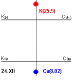 "K"=19mg%-24mg%, для "Ca"=9mg%-13mg%. Таким образом, 19mg% "K" соответствует
