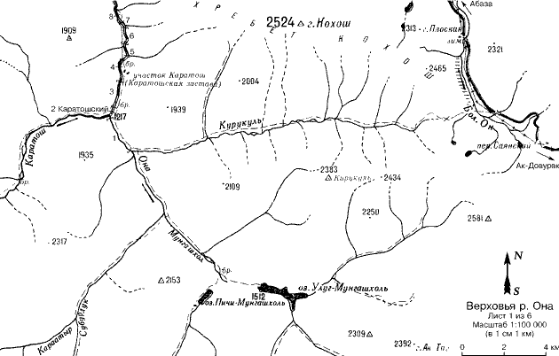 От километрового столба 311/105 км на трассе Абакан - Ак-Довурак несколько троп вразнобой спускаются вправо, в болотистую низину, по дальнему краю которой протекает р. Большой Он. Ориентиры традиционные: первый - единственная нестандартная опора ЛЭП (одиночная, тогда как остальные П-образные), второй - кедровая роща на склоне долины. Пер. Кохошский, через который лежит дальнейший путь, находится левее рощи и легко идентифицируется при взгляде с дороги. Ходовое время от дороги до кедровой рощи 10 мин. Это удобное место для спокойной стоянки после долгой дороги, но именно по этой причине дровами оно небогато.