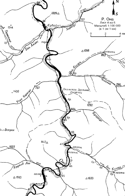 39. Чистая горка с валами в сужении русла. Это последнее препятствие Верхней Оны. Долина расширяется, за ней начинается котловина пос. Б. Он., появляются лесные дороги и броды.