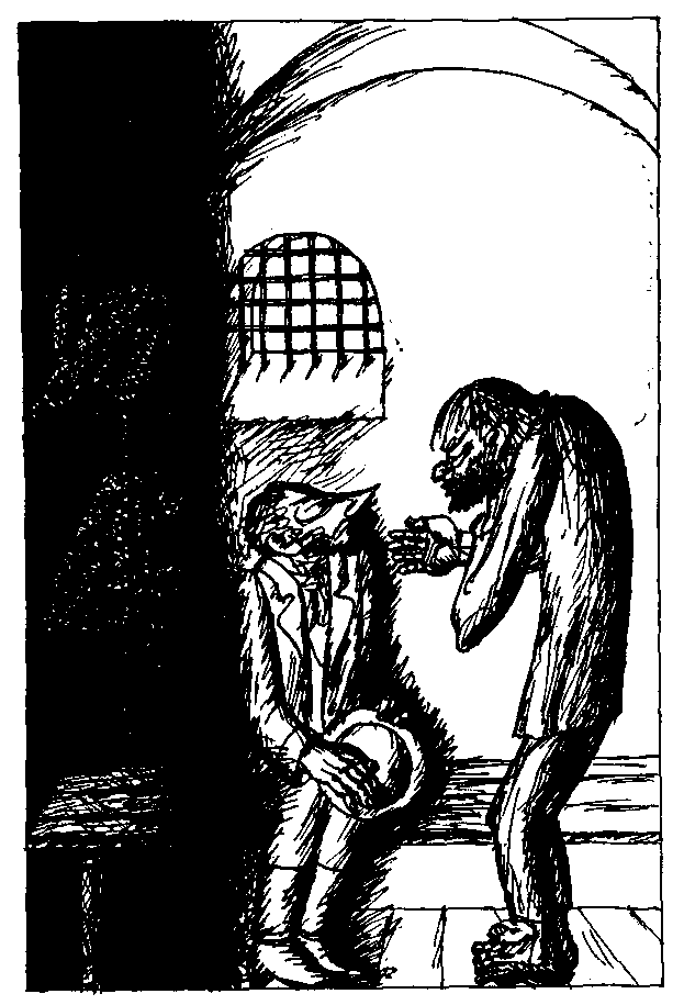 arestantskoj shineli, dlinnoj, do pyat, s cepyami na  rukah  i  nogah.  Ostryj,