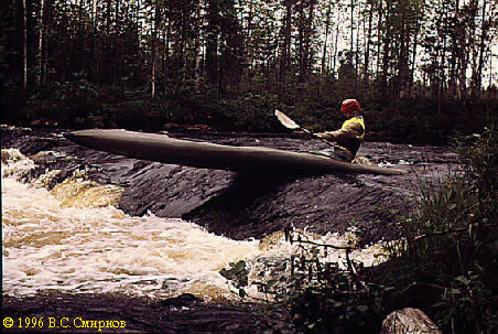 Porog No14 (Ib, 50 m). Na vyhode, poperek pravoj chistoj strui -- srublennoe derevo. Uhod vlevo, mesta dlya manevra dostatochno. Luchshe osmotret'. CHerez 5 min --