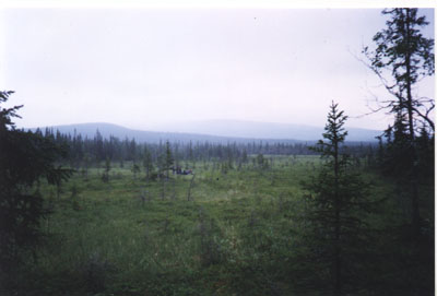 Ot "broda" do granicy lesa v verhov'yah CHortuya shli dva dnya. V dolinu Vuvy popali "vzyav shturmom" otrog gory sprava ot Vuima. |tot otrog my vnachale oshibochno prinyali za nuzhnyj nam pereval. S otroga horosho vidna bezlesnaya dolina Vuvy, nuzhnyj pereval v dolinu Pechi, skaly nad oboznachennym na karte ozerom na sklone. S otroga shli traversom, ne teryaya vysoty k perevalu. Proshli ryadom s ozerom