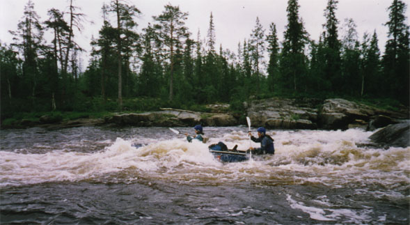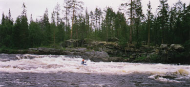(CHego stoil kamen' razmerom s golovu, kotoryj sluchajno zavalilsya cherez dno i ostalsya v lodke.) Posle Pechozera nachinayutsya porogi. Porog-ples-porog - kak tipichnaya karel'skaya rechka. Pervye 2-3 - nebol'shie. Korotkie i malen'kim padeniem. Zdes' i dalee u vseh nepriyatnaya cherta - struya na vyhode iz poroga kak by "razmyvaetsya", stanovitsya melkoj, kamni vylezayut na poverhnost'. Mnogo nepriyatnostej eto dostavlyalo Tajmenyu. Posle primerno polukilometrovogo plesa nachinaetsya porog, kotoryj, kak i bol'shinstvo posleduyushchih mozhno nazvat' "Krivym". Pryamoj uchastok pered nim, vysokij pravyj bereg. Porog nachinaetsya i srazu uhodit vlevo pochti pod pryamym uglom. Pryamaya posle povorota struya, mnogo oblivnyh kamnej, za kotorymi kroyutsya malen'kie, kovarnye dlya nachinayushchih kayakerov ulova. Posle poroga, kak voditsya, obshirnyj ples. Sleduyushchij znachitel'nyj porog - "Padun". Za levym povorotom, horosho slyshen. Prosmotr sleva. "Padun" kak "padun", nichego osobennogo.