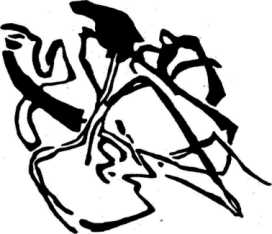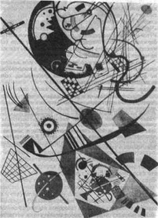 и довольно равномерного распределения.** Невольно вспоминаются старинные хоровые композиции, Моцарт и, наконец, Бетховен. Все эти произведения имеют большее или меньшее сродство с возвышенной, полной покоя и достоинства архитектурой готического собора: равновесие и равномерное распределение отдельных частей являются камертоном и духовной основой подобных конструкций. Подобные произведения принадлежат к переходным формам.В качестве примера новых симфонических композиций, в которых мелодический .элемент находит применение лишь иногда и как одна из подчиненных частей, но получает при этом новую форму, я прилагаю репродукции трех моих картин.
