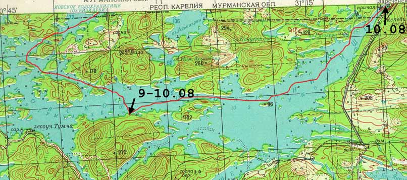 Маршрут выбрали по карте (по листам комплекта Северная Карелия 1:200000) подальше от обычных мест. Описаний в турклубе не нашли.