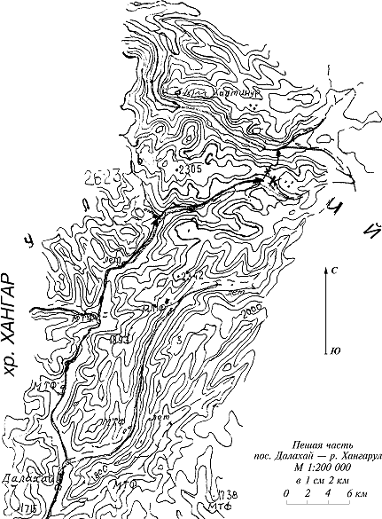Сейчас тропа вдоль ручья на перевал хорошо наезжена и легко заметна вплоть до границы леса, где склон несколько выполаживается. Подъем до этого места с лодками занял у нас около часа. Здесь нас догнали буряты на лошадях, ехавшие на рыбалку на Хангарул. Привязав лодки к седлам на длинной веревке, они по травянистому склону дотащили их до перевала. Оставив лодки на перевале, вернулись в лагерь. На следующий день сделали вторую ходку и дошли до Хангарула; подъем на перевал занял 1 ч 30 мин.