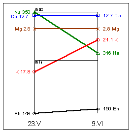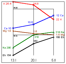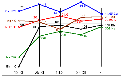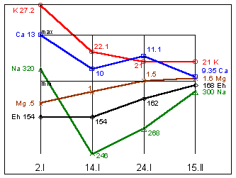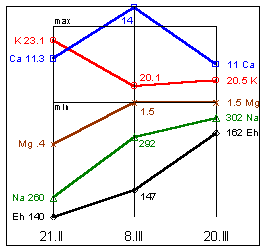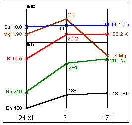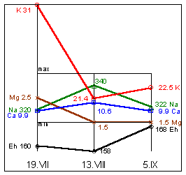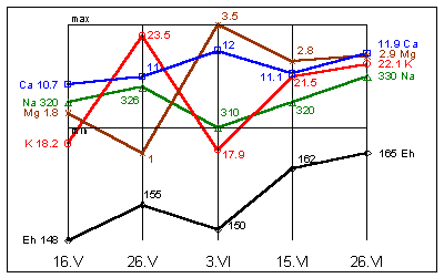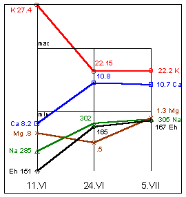 K=16,5mg%; Mg=1,98mg%; Ca=10,8mg%; Eh=130мВ.