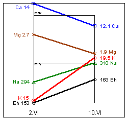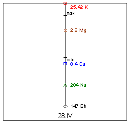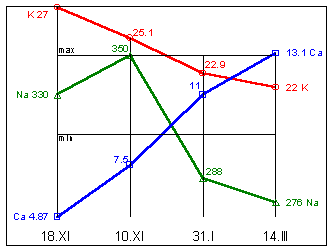K=19,5mg%; Mg=0,3mg%; Ca=12,75mg%; Eh=146мВ.