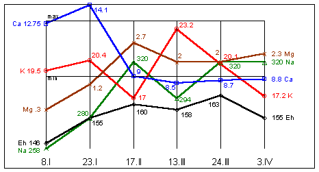K=18,5mg%; Mg=1mg%; Ca=9,5mg%; Eh=163мВ.