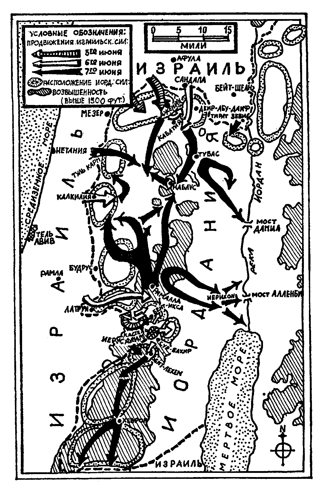 и все были на юге. Саперы Ури шли впереди танков и обезвреживали мины, но из-за быстрого продвижения сорок человек были ранены взрывами мин. 13.20. Взята высота Абдул Азиз. Ури сообщил, что высота с радарной установкой в наших руках, но добавил, что без миноискателей или танков с молотильными цепами продвижение замедлится. Взята Бейт-Икса. Ури: В 13.00 мы получили приказ овладеть горным кряжем между Рамаллой и Иерусалимом. Позиции в этом районе были с давних пор хорошо разведаны. Я помню, как двадцать лет назад мы несколько раз атаковали высоту с радаром. Сначала мы захватили ее, потом кто-то ее сдал. Это была бетонированная позиция, подобно Абдул Азизу, тогда как Бейт-Икса являлась укрепленной деревней. Если бы кто-нибудь в Академии генерального штаба доказывал своим слушателям, что танковая бригада может в течение четырех часов атаковать иерусалимские позиции с равнины, то ему пришлось бы распроститься с работой лектора. Но мои люди сделали это. Главной трудностью было взять бункеры. Мы направили на каждый бункер по танку, и между 17 и 19 часами огонь из всех бункеров был подавлен. Затем в дело была введена моторизованная пехота, которая, проявив немалое упорство, обезвредила в темноте с помощью миноискателей одну за другой все мины. Наркис опасался, что 60-я иорданская танковая бригада устроит Ури засаду на стыке дорог Рамалла-Иерусалим, однако рассчитывал, что Ури опередит противника. 20.00. Наркис прибыл в Иерусалим. Сур Бахир был в наших руках; наблюдались явные признаки подготовки иорданцев к контратаке. Наркис отправился в Кнесет, чтобы там встретиться с Даяном, которого должны были привести к присяге как министра обороны. Даяна в Кнесете не было, церемония была отложена. Даян вообще не приносил присяги до прекращения военных действий. Наркис встретился с Мотой, который сообщил ему, что он готовится перейти в наступление в полночь. Наркис приказал своей ставке обратиться в генеральный штаб за разрешением взять Латрун. Наркис просил, чтобы авиация продолжала наносить удары по расположениям 60-й иорданской бригады. У него был спор с Бар-Левом о времени начала наступления Моты. Войска Моты выступили в направлении Иерусалима в 19.00 и должны были быть готовы к бою в 2.00 во вторник. Генеральный штаб назначил начало наступления при поддержке артиллерии и авиации на следующее утро в 8.00. Наркис сказал им, что нельзя вводить в действие авиацию в связи с близостью Иерусалима и убедил их перенести начало наступления на 2.00. 24.00. Главный раввин армии генерал Шломо Горен посетил в полночь Наркиса и заявил ему: "Твои люди делают историю: то, что происходит в Синае, ничто по сравнению с этим". Наркис посоветовал ему приготовить шофар (рог). Вторник 6 июня 1967 года. 1.40. Наркис сопровождал Моту на его командный пост неподалеку от полицейской школы. Вся израильская часть Иерусалима подвергалась артиллерийскому и минометному обстрелу. Когда Наркис и Мота производили оценку положения, 25-фунтовый орудийный снаряд разорвался на крыше, на которой они стояли. К счастью, снаряд попал в парапет, и никто не пострадал. Мота: В 2.20 наша артиллерия открыла огонь, а наши танки устремились вниз по обрывистой дороге и заняли свою позицию. Услыхав грохот приближающихся танков, противник открыл огонь из всех своих укреплений. Интенсивность артобстрела повысилась. Но танки продо