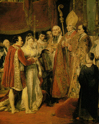 11 marta 1810 g. v Vene, v sobore, okruzhennom massoj naroda, pri samom torzhestvennom ceremoniale, v prisutstvii vsej imperatorskoj avstrijskoj familii, vsego dvora, vsego diplomaticheskogo korpusa, sanovnikov, generaliteta sostoyalos' brakosochetanie 18-letnej ercgercogini Marii-Luizy s imperatorom Napoleonom. Nevesta nikogda v glaza ne vidala zheniha, ona ego dazhe i v den' svad'by ne videla, potomu chto on, kak skazano, schel izlishnim samomu obespokoit'sya hotya by dlya takogo isklyuchitel'nogo sluchaya, kak sobstvennaya svad'ba, lichnoj poezdkoj v Venu. No s etim v Vene primirilis'. Marshal Bert'e i ercgercog Karl vdvoem s dostoinstvom prodelali vse te manipulyacii, kotorye podobalo prodelat' zhenihu. CHitatel', nesomnenno, neskol'ko udivitsya i sprosit: kak eto vozmozhno dvum licam izobrazhat' otsutstvuyushchego zheniha? Udivlyalis' i sovremenniki, ne iskushennye v detalyah carstvennyh svadeb. Bert'e byl poslan Napoleonom v Venu izobrazhat' soboj imperatora Napoleona i formal'no prosit' ruki Marii-Luizy, a ercgercog Karl, po pros'be i pryamomu priglasheniyu Napoleona, dolzhen byl yavit'sya v cerkov', i zdes' Bert'e vruchil emu Mariyu-Luizu, kotoruyu ercgercog Karl (tozhe, kak do toj pory Bert'e, izobrazhaya soboj Napoleona) povel k altaryu i stoyal s nej ryadom vo vremya bogosluzheniya, posle chego novaya francuzskaya imperatrica byla otpravlena s podobayushchimi pochestyami i svitoj vo Franciyu. Pri proezde cherez vassal'nye strany (naprimer, Bavariyu) ej vsyudu davali pochuvstvovat', chto ona - supruga povelitelya Evropy. Napoleon vstretil ee nedaleko ot Parizha, po doroge v Komp'en. Tut tol'ko suprugi v pervyj raz v zhizni uvideli drug druga.