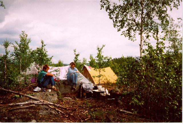 Обнос по левому берегу: начало тропы-дороги у пляжика в крутом береге через несколько сот метров от начала канала. Течение довольно шустрое и пропускать место выгрузки не рекомендуется. Идем сразу с байдаркой на плечах по тропе в горку, в лес, через заброшенные бараки. В общем, читается легко. Дальше дорога идет над озером. Стоянка-пикник у выхода из озера над второй ступенькой. Здесь основной перепад высоты. Рассмотреть деталей с байдаркой на плечах и из-за высокого лесистого берега не удалось. Около озера Райтус дорога уходит налево. Ломимся по маленькой тропке прямо к берегу - а зря: тут опять дорога, сходящаяся с нашей через 50 м в стороне. Есть и стоянка-пикник (костер, куча бутылок, нет следов палаток). С дровами плохо. Приходится валить ствол двуручкой. Это единственный случай использования за весь поход. Заканчиваем часам к 9 вечера. Получилось три ходки мужских (два тайменя, рюкзаки) и две женских. Откуда столько барахла взялось - непонятно. Рядом слышны звуки дороги Кандалакша - Зареченск.