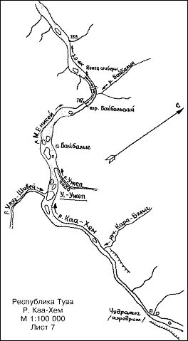 На р. Каа-Хем порогов всего несколько штук, разделенных протяженными плесами. Все они имеют собственные имена.
