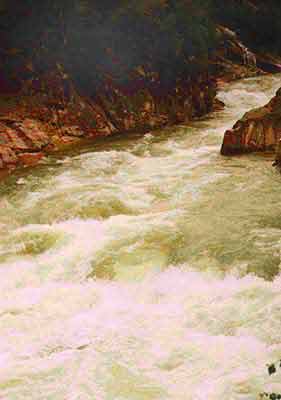 24 июля Дежурные Рома с Виталием. Всю ночь шел дождь, вода в реке прибыла на 30 см (а место не узкое). Цвет воды от зеленого перешел ближе к коричневому. Выходим часов около 11. Проходим оставшиеся пороги и шиверы до 19 порога. Перед ним встречаем группу из Кирова. Их стоянка расположена по левому берегу. Постепенно начинаем подходить к 19 порогу, перед ним чалимся, разведаем. Первую половину порога (до осыпи слева) решаем пройти как обычно, только пассажиры идут по берегу. Четверка проходит по основной струе ближе к правому берегу, я на двойке с Верой идем между камней недалеко от правого берега. Не доходя до осыпи метров 50 - чалимся. Стас с Ромкой идут на разведку, и мы остаемся ждать. Время близиться к обеду. Они проходили два часа, мы уже совсем собрались обедать. Спускаем катамараны дальше, за осыпь, на чалках. Затем проходим на четверке сильным экипажем еще метров 300. Двойку спускаем на чалке. Вода несет уже совсем бешенная, ближе к водопаду уклон увеличивается. С этого места (метров за 300 -400) начинаем обнос. Сначала несем рюкзаки. Вдоль по склону идет тропа. Мы пристали немного ниже маленького ручейка. Первые метров 200 тропа идет одна. Затем она разветвляется на две. Нижняя, по которой мы обносились, - нормальная тропа. По ней можно нести даже неразобраный катамаран четверку (правда тяжело). В одном месте там нужно штурмовать крутой каменный подъем, а, несколько дальше, есть достаточно крутой спуск. Длина тропы до того места, откуда мы собирались выходить, около 3 -3.5 км. Идти с грузом около 40 минут. Пройдя метров 100 по тропе, видна последняя горка перед водопадом. Слив с огромной бочкой смещен несколько вправо от центра реки. По моему мнению, в нашу воду этот слив категории 5..6, в нем могло бы спокойно кильнуть нашу четверку. Тропа обноса идет по заболоченной местности, и пригодных для стоянки мест долгое время нет. Тропа идет высоко, но можно спокойно приблизиться к краю обрыва и рассмотреть пороги в ущелье. Первый порог - водопад,