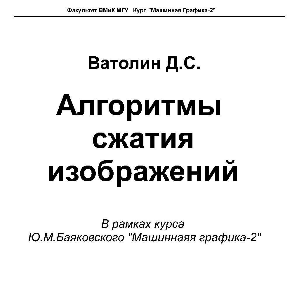 Ватолин Д.С. Алгоритмы сжатия изображений. Методическое пособие. Пособие знакомит с основными понятиями сжатия изображений, базовыми алгоритмами и современными направлениями развития теории сжатия изображений. Пособие можно рассматривать как практическое руководство. Оно рассчитано на читателей, знакомых с языком программирования C++ и имеющих представление о базовых алгоритмах. Рекомендуется студентам, аспирантам, научным сотрудникам и инженерам весьма широкого круга специальностей. Рецензенты: Кумсков М.И., д.ф.-м.н. Печатается по решению Редакционно-Издательского Совета факультета Вычислительной Математики и Кибернетики Московского Государственного Университета им. М.В. Ломоносова ISBN 5-89407-041-4 (с) 1999 Лаборатория Компьютерной Графики ВМиК МГУ им. М.В. Ломоносова |